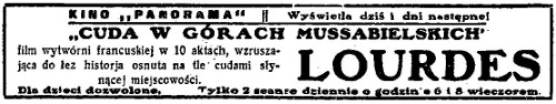 Reklama filmu: „Cuda w Górach Mussabielskich” Lourdes, Goniec Częstochowski 1932, nr 88, str. 2